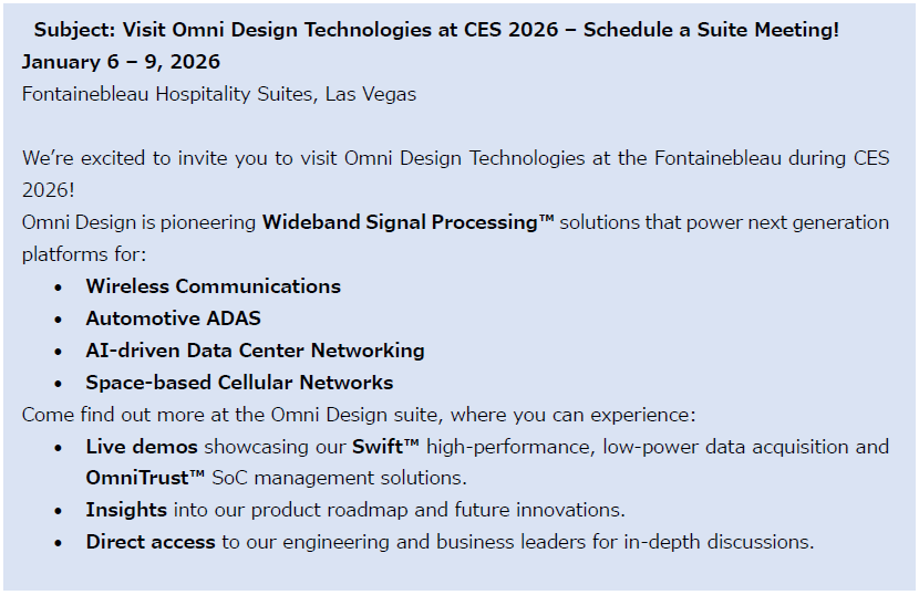2025年12月23日 / 最終更新日 : 2025年12月22日 SawaiMiki イベント情報 『CES 2026』出展のご案内 株式会社ジーダット イベント情報 2025年12月23日 イベント 『CES 2026』出展のご案内 お客様各位 2025年12月23日株式会社ジーダット 『CES 2026』出展のご案内 このたび弊社のパートナーであるOmni Design Technologies社が、来る2026年1月6日(火)から9日(金)まで米国ラスベガスにて開催される『CES 2026』に出展いたします。 皆様のご来場をお待ちしております。 ミーティングのご予約はこちらから CES2026サイトはこちら お問合せは までお願いいたします。 皆様のご来場をお待ち申し上げております。 以上